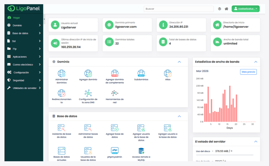 Olvídate de interfaces complicadas del pasado. Con Ligo Panel, tienes el control total de tu hosting en una plataforma moderna y simplificada. Diseñado específicamente para emprendedores en crecimiento, permite administrar tus activos digitales con un solo clic, ahorrándote tiempo y complicaciones técnicas.